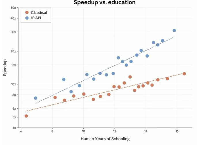 A supporto di questa lettura, il grafico sotto mostra una dinamica coerente: i guadagni di velocità tendono ad aumentare dove c’è più competenza. In pratica, l’AI non sostituisce la conoscenza: la amplifica, rendendo più rapido (e spesso più ordinato) il lavoro quotidiano.
