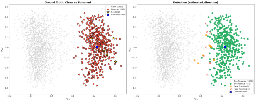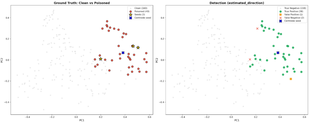 - Analisi Direzionale: Questo metodo stima la “direzione di attacco” confrontando il centroide globale dei dati con quello dei seed malevoli. Proiettando i documenti lungo questo vettore, è possibile separare i contenuti sospetti che mostrano uno spostamento coerente rispetto al bulk dei dati puliti.